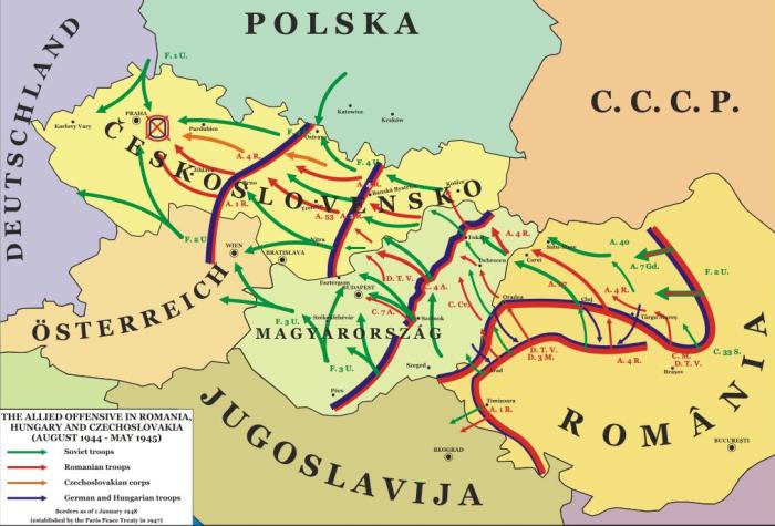 Jednotky oslobodzovacích armád vítali takmer na celom území ČSR Prvú z dvoch operácií uskutočnili vojská 4. ukrajinského frontu ( na území Slovenska len jeho 18. armáda s 1. čs. armádnym zborom ) od 10. marca do 5. mája 1945. Druhú operáciu vojská 2. ukrajinského frontu ( 7. gardová, 46., 53., a 40. armáda, 6. gardová tanková armáda, 1. a 4. rumunská armáda, 1. gardová jazdecko-mechanizovaná skupina, Dunajská vojnová flotila ) v čase od 25. marca do 5. mája 1945.