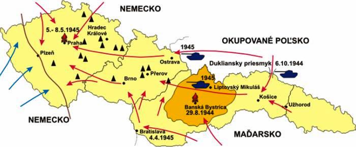 Postup oslobodzovacích armád cez územie Československa ( mapa sa po "kliknutí" zväčší ) Vojská 4. ukrajinského frontu ( 1. gardová a 18. armáda s 1. čs. armádnym zborom ) a 2. ukrajinského frontu ( 40., 27., 53. armáda 1. a 4. rumunská armáda ) uskutočnili na území Slovenska od 12. januára do 28. februára 1945 Západokarpatskú operáciu, počas ktorej bol oslobodený Zvolen a Banská Bystrica. Poslednými operáciami sovietskych frontov v čase oslobodzovania Slovenska bola Bratislavsko-brnianska operácia a po nej nasledujúca Ostravská operácia, v ktorej bojovali aj tankisti a letci 1. ČSAZ v ZSSR.