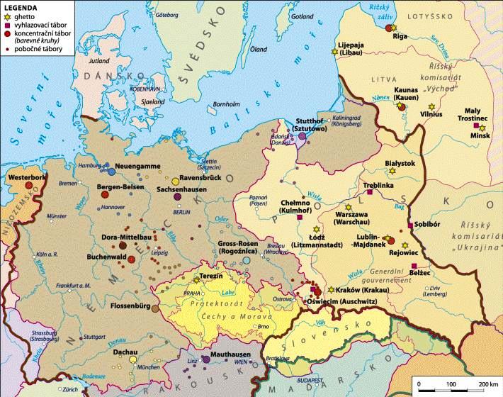 ![]() ( Po kliknutí sa foto zväčšia ) V Nemeckom okupovaných krajinách vyhľadávali špeciálne komandá Židov a sústreďovali ich v zberných táboroch. Najprv im zabavili peniaze, klenoty a všetko čo malo cenu, potom ich natlačili do dobytčích vagónov. Počas niekoľkodňovej cesty bez vetrania, vody, potravín a ohľadu na počasie zahynulo mnoho deportovaných už vo vagónoch. Do vyhladzovacieho tábora Osvienčim prichádzali okrem transportov poľských a nemeckých Židov od leta 1942 aj transporty z Francúzska Holandska, Belgicka, Grécka, Talianska, Nórska, Chorvátska aj zo Slovenska. Viac je tu : otvoriť >>> Začiatok videa je na stránke YouTube tu : otvoriť >>> Na YouTube je už podmienené potvrdením veku ! O osude ľudí z transportov sa rozhodovali príslušníci SS hneď po ich príjazde do tábora. Tzv. selekcia sa vykonávala na železničnej rampe po vystúpení ľudí z vagónov. Rozdeľovali ich na schopných pracovať a na ostatných. Asi 80 % z deportovaných oddelili po ich príjazde do tábora a okamžite ich posielali do neďalekých plynových komôr. Boli to predovšetkým všetky deti do 14 rokov, muži nad 60 a ženy nad 45 rokov, ako aj starí, slabí a chorí ľudia. Do konca roka 1944 povraždili v tábore plynom dva a pol milióna Židov. Ich telá potom spaľovali v peciach táborového krematória. Viac je tu : otvoriť >>> ![]() Mapa nacistických koncentračných táborov ( Po kliknutí sa mapa zväčší ) Práceschopní väzni museli žiť v neľudských podmienkach a pracovať ako otroci v okolitých pracovných táboroch až do úplného vysilenia. Mnohí z nic neprežili kruté podmienky v tábore dlhšie ako 70 dní. Väčšinou ich nasadili na nútené práce v neďalekých chemických továrňach patriacich koncernu I.G. Farben. Približne pol milióna väzňov v nich podľahlo epidémiám, chorobám z hladu, vyčerpania a podchladenia. Mnoho ich bolo povraždených aj surovými príslušníkmi SS. Posledné obete si vybrali vražedné "pochody smrti" používané k odsunu väzňov pri evakuácii tábore pred príchodom sovietskej armády. Pokračovanie informácie a 2. časti dokumentárneho filmu je tu : otvoriť >>> Súvisiace informácie : <<< späť na hlavnú stránku. |