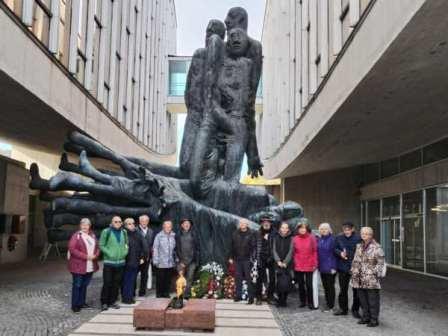 Účastníci zájazdu pred prehliadkou expozícií v Múzeu SNP SNP ( po "kliknutí" sa foto zväčší ) Obedovali sme v troch rôznych zariadeniach niekdajšieho RAJ-a na námestí SNP (podľa chuti jednotlivých členov). Na námestí SNP sme tiež poobdivovali cenné historické stavby a presunuli sa na neďaleký Evanjelický cintorín na Lazovnej ulici, kde je aj z celosvetového hľadiska pochovaný zrejme najväčší počet predstaviteľov národného hnutia z rôznych období od začiatku 18. storočia. Hroby sme očistili a uctili si pamiatku našich dejateľov položením malých vencov a zapálením sviečok.