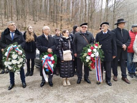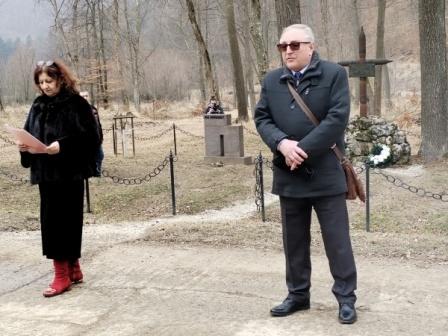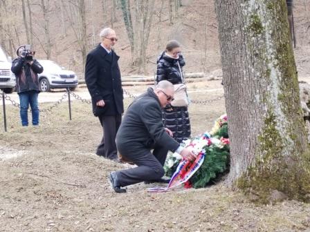 Pomník a hroby 26 Rómov zavraždených 23. februára 1945 ( po "kliknutí" sa foto zväčší ) Po otvorení stretnutia organizátormi a štátnej hymne Slovenskej republiky boli k pomníku položené vence alebo kytice zúčastnenými delegáciami i rodinnými príslušníkmi zavraždených Rómov. Veniec za Ústrednú radu Slovenského zväzu protifašistických bojovníkov položil k pamätníku Kamil Krištofík a delegácia Oblastného výboru SZPB Trenčín. ktorú viedla jeho tajomníčka Eva Poulová. V delegácii OblV SZPB Trenčín boli aj členovia Základných organizácií z mesta Trenčín. S príhovorom vystúpil aj delegát predsedníctva ÚR SZPB Kamil Krištofík. Video je na stránke YouTube tu : otvoriť >>> Popravení Rómovia boli chorí obyvatelia takzvaného Zaisťovacieho tábora pre Cigánov, zriadeného 2. novembra 1944 ministerstvom národnej obrany vojnovej Slovenskej republiky. V predmetnom tábore boli internované aj celé rómske rodiny bez ohľadu na vek a pohlavie. Ich počet zakrátko viac ako dvojnásobne prevyšoval kapacitu tábora. V decembri 1944 bolo v tábore internovaných viac ako 700 väzňov. Zima zlé hygienické pomery v tábore umožnili vypuknutie epidémie škvrnitého týfusu. Do polovice februára 1944 v tábore zomrelo 43 osôb.