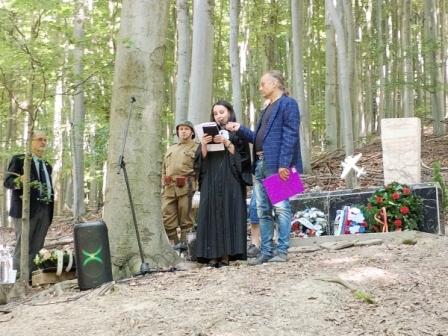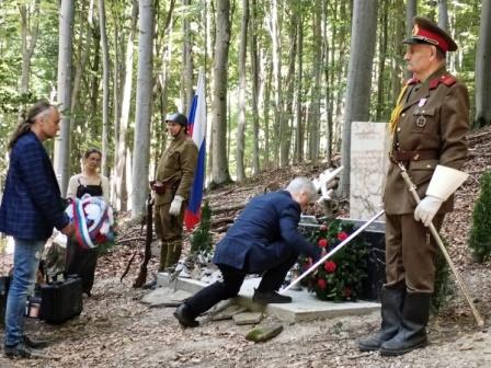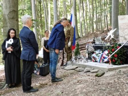 Položenie vencov k pamätníku ambasadorom Rumunska a predsedom ZO SZPB Melčice ( po "kliknutí" sa foto zväčší ) Po piesni "Na horách partizán bojuje" nasledoval príhovor Márii Hládekovej, starostky obce Ivanovce a štátne hymny Slovenskej aj Rumunskej republiky. Slávnostné odhalenie pamätníka sa začalo spevom rumuského vojenského pochodu Drum bun a príhovorom Miroslava Ondráša, podpredsedu OblV SZPB Trenčín o oslobodzovaní územia trenčianskeho regiónu v roku 1945. Následne Jozef Horečný pospomínal na vznik pamätného miesta, hľadanie v archívoch a vznik slávnostných pochodov na počesť padlých rumunských letcov. Video s textom pochodu "Drum bun" je uložené na : YouTube) Melódiou piesne Áve María hraných na husliach začínala krásne slová Jana Drottnerová, ev. farárka z obce Zemianske Podhradie, ktorá oslovila prítomných modlitbou za spásu duší vojakov a najmä jej slová "Bože daj nech sa z vojenských hrobov dvíha modlitba, nie pre vojnu, ale pre pokoj" vtisli slzy viacerým účastníkom stretnutia.