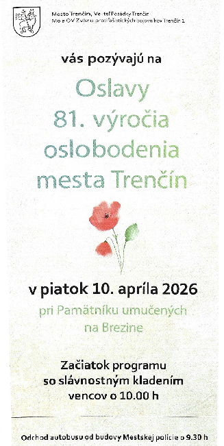 ( informácia má prílohy ) Trenčania si výročia oslobodenia mesta tradične pripomínajú na stretnutiach v lesoparku Brezina pri pamätníku na cintoríne obetí po mučení zavraždených nemeckými okupantmi ešte pred príchodom oslobodzovacích jednotiek sovietskej Červenej armády a Rumunskej kráľovskej armády. Mesto bolo oslobodené ráno 10. apríla 1945 iba po koryto rieky Váh z dôvodu, že Nemci pri ústupe zničili oba mosty a silne sa opevnili na západnom brehu rieky. Rozvodnený Váh sa tak stal neprekonatelnou prekážkou, ktorú oslobodzovacie útvary nedokázali v ten deň prekonať. Viac je tu : otvoriť >>>